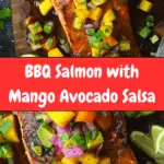Sweet and smoky BBQ salmon fillets topped with a fresh, zesty mango avocado salsa. This colorful and healthy dish is quick to make, perfect for weeknight dinners or summer gatherings.