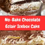 A rich and creamy no-bake dessert made with layers of vanilla pudding, whipped topping, and graham crackers, topped with smooth chocolate ganache. As it chills, the crackers soften into a cake-like texture, creating a sliceable treat that tastes just like a classic chocolate eclair.