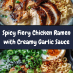 This Spicy Fiery Chicken Ramen with Creamy Garlic Sauce is a bold fusion of spicy flavors and creamy comfort. I cook tender chicken breast strips with a smoky spice blend, then serve them over ramen noodles drenched in a silky garlic-Parmesan cream sauce. It’s hearty, warming, and full of contrast—perfect for when I crave something rich with a kick.