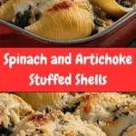 Spinach and Artichoke Stuffed Shells are a creamy, cheesy, and comforting vegetarian pasta dish filled with ricotta, mozzarella, Parmesan, spinach, and artichoke hearts, baked in marinara sauce to perfection.